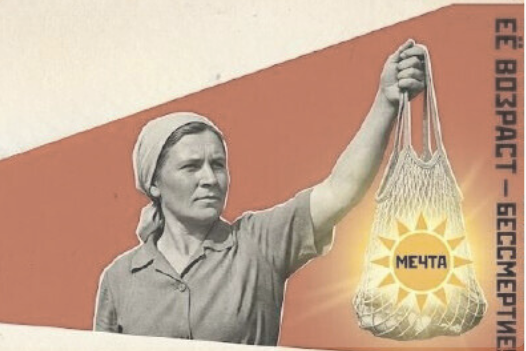 Женщина. В косынке поверх русых волос, в белой блузке с воротничком и… с авоськой.